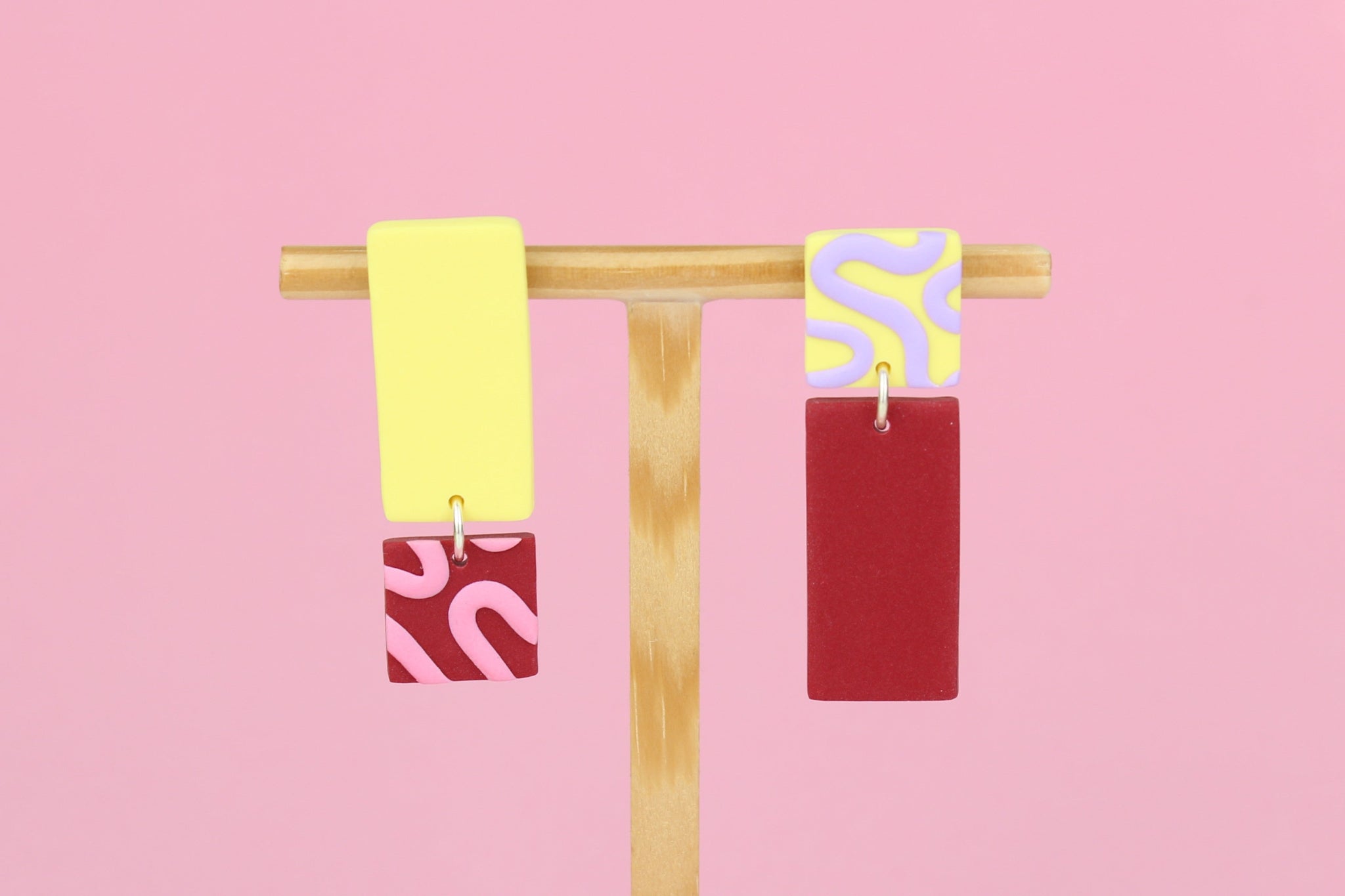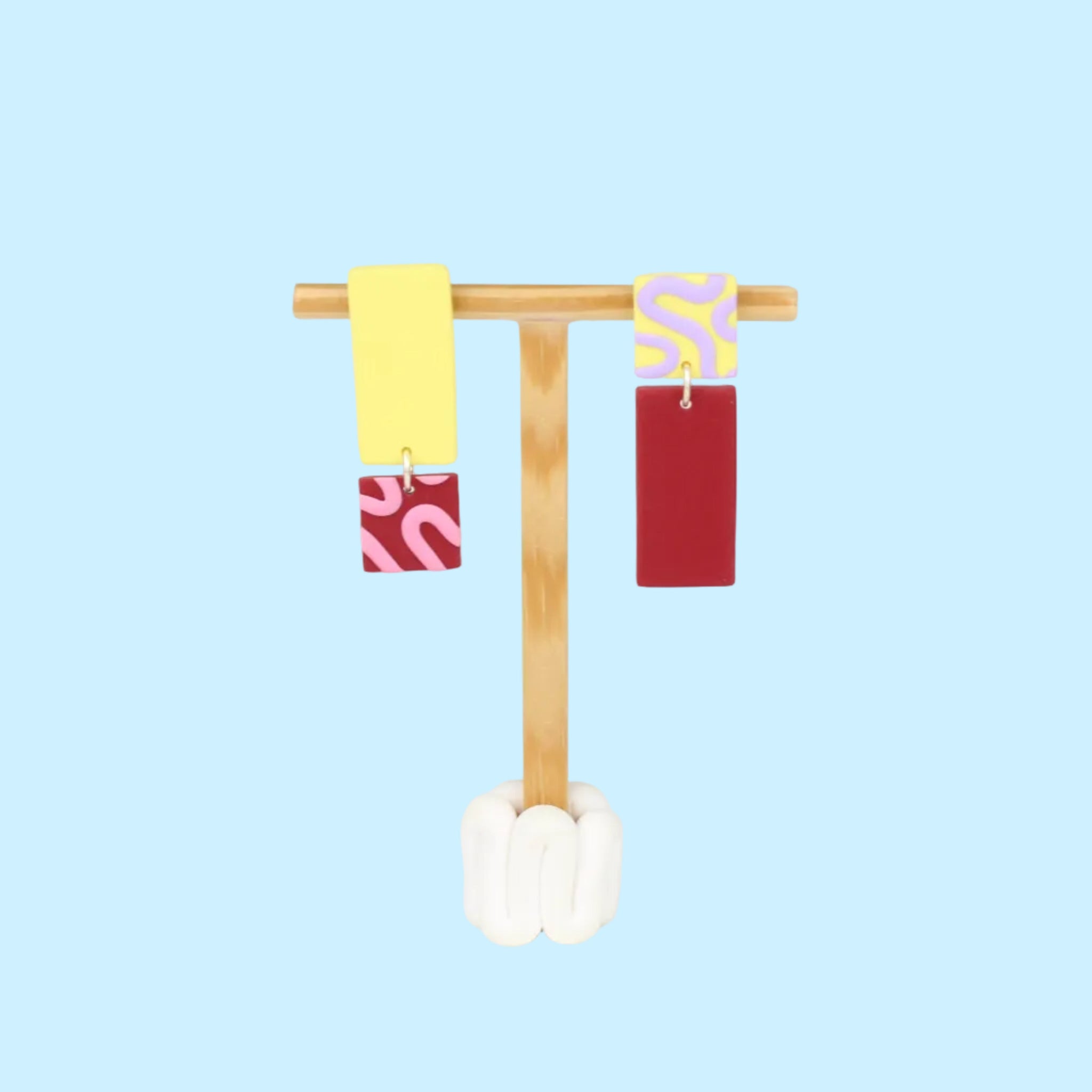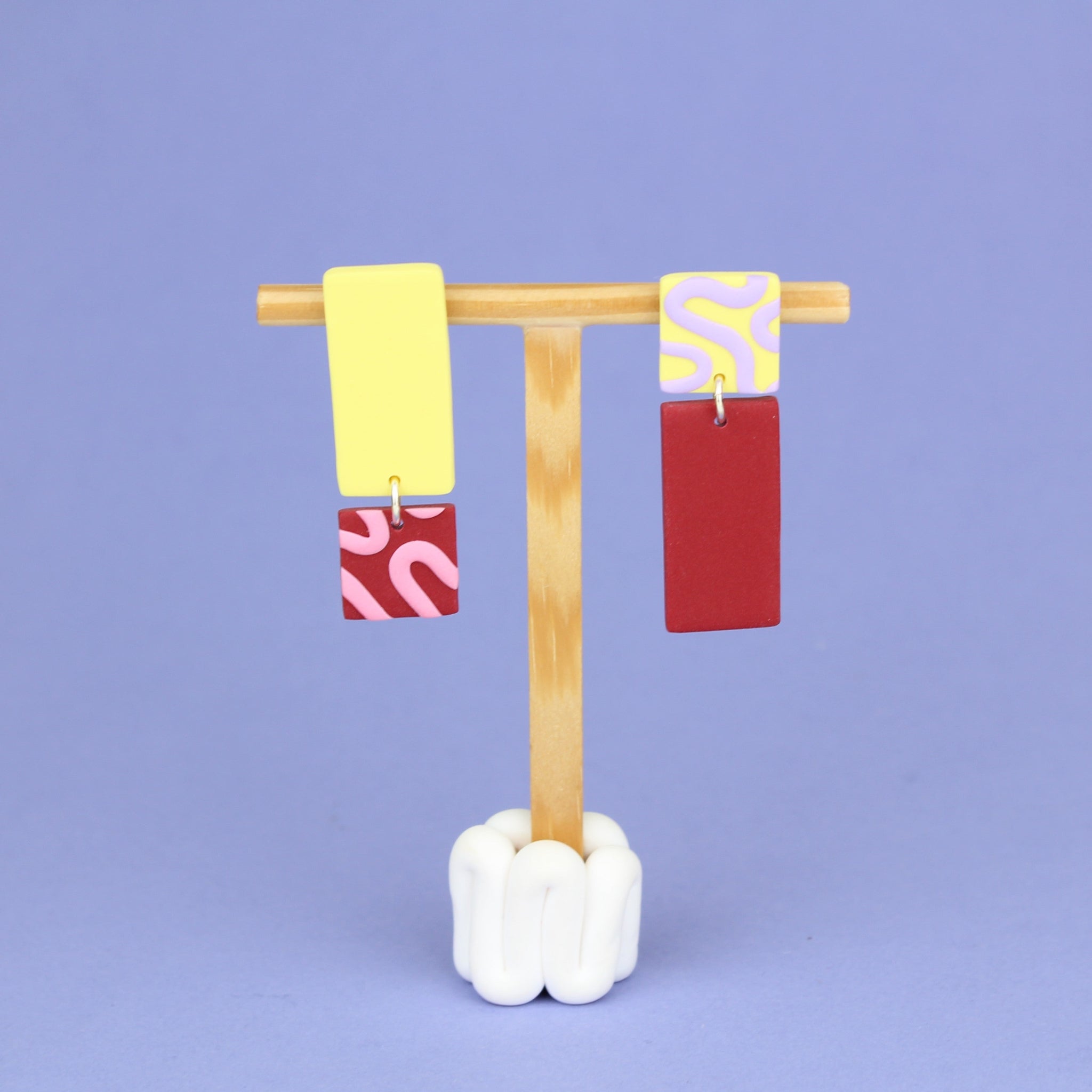 Schmuck gegen langweilig. Die rechteckigen und quadratischen Elemente der grafischen Ohrhänger sind asymmetrisch versetzt angeordnet: einmal lang oben, einmal kurz. Gelb, Dunkelrot und Flieder stehen in klarem Kontrast zueinander und bringen Frische ins Design. Die Schlangenlinien sorgen für Bewegung – ein subtiles Kopfnicken Richtung Op Art, Memphis und Grafikdesign.