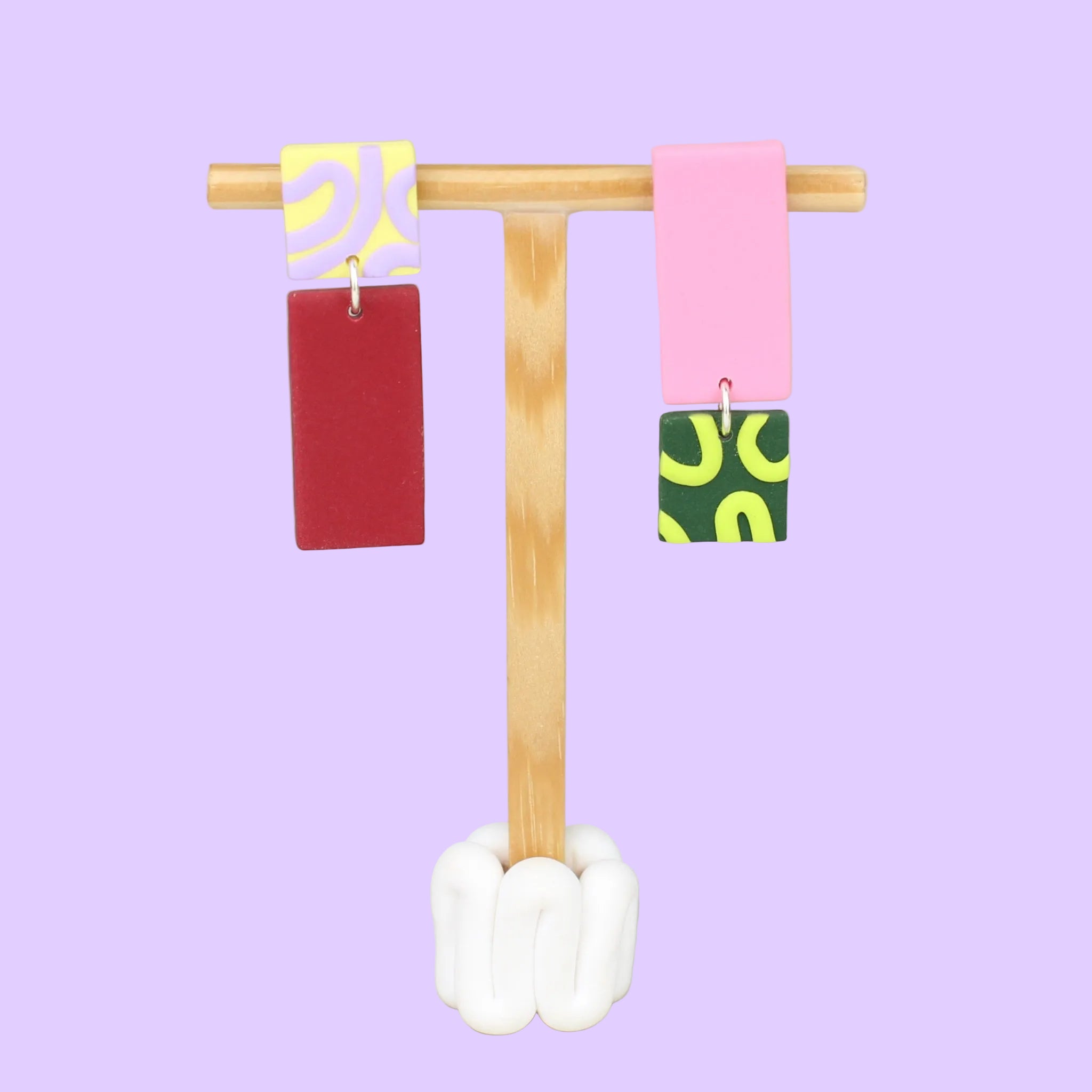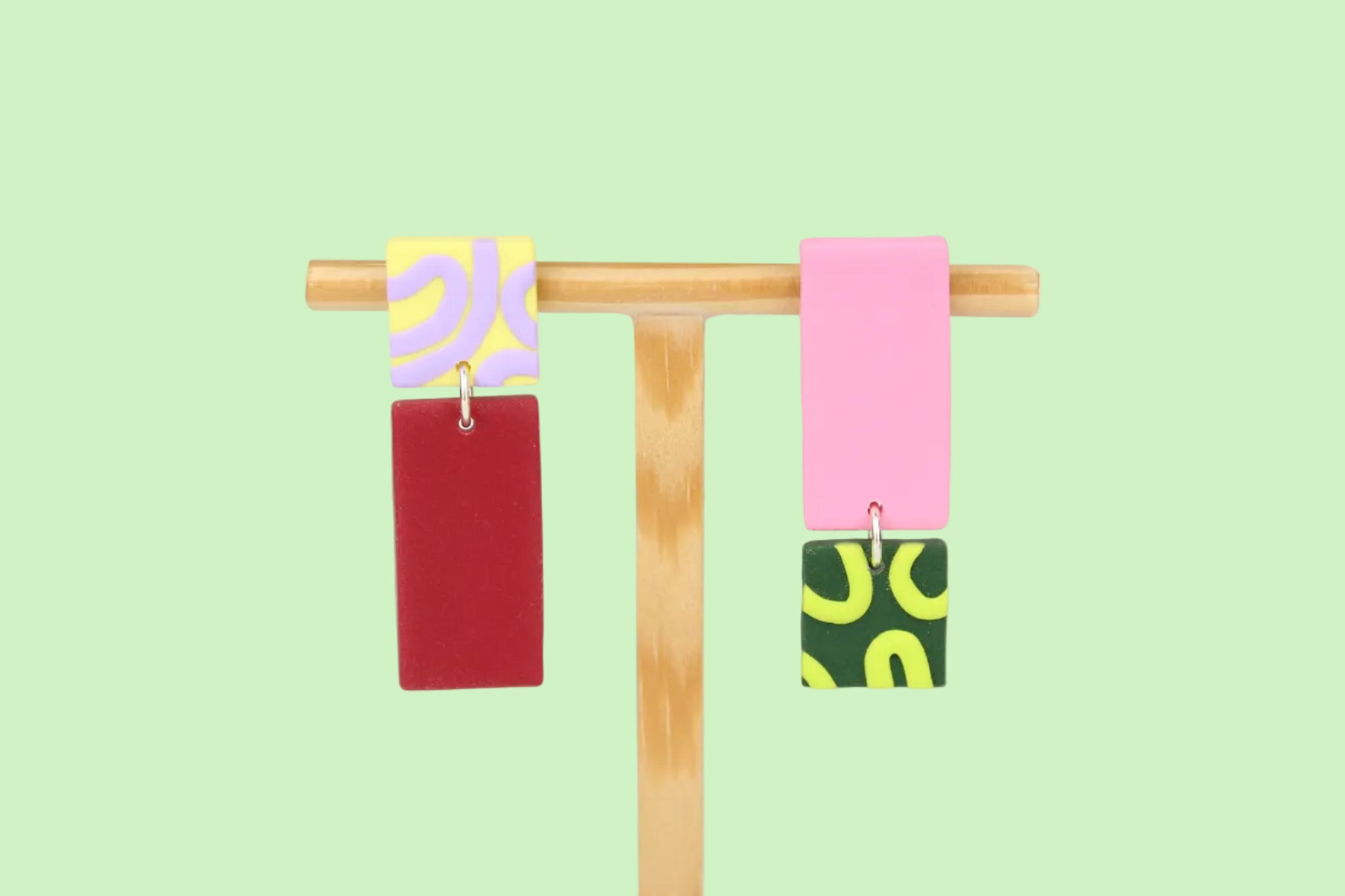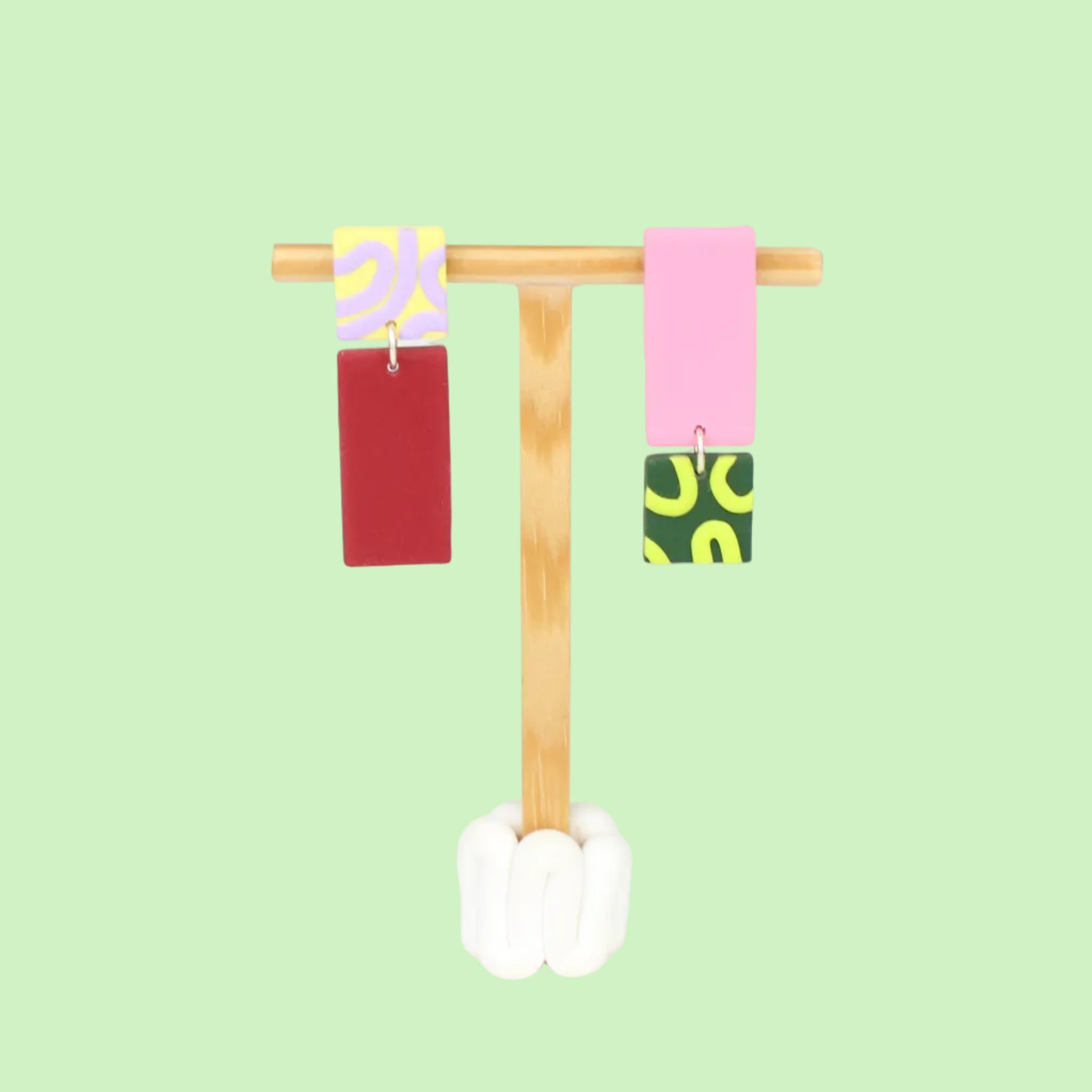 Schmuck gegen langweilig. Die rechteckigen und quadratischen Elemente der grafischen Ohrhänger sind asymmetrisch versetzt angeordnet: einmal lang oben, einmal kurz. Sechs unterschiedliche Farben treffen hier aufeinander und bilden ein spannungsreiches Zusammenspiel aus Kontrast und Balance. Die Schlangenlinien bringen Bewegung ins Design – ein subtiles Kopfnicken Richtung Op Art, Memphis und Grafikdesign.