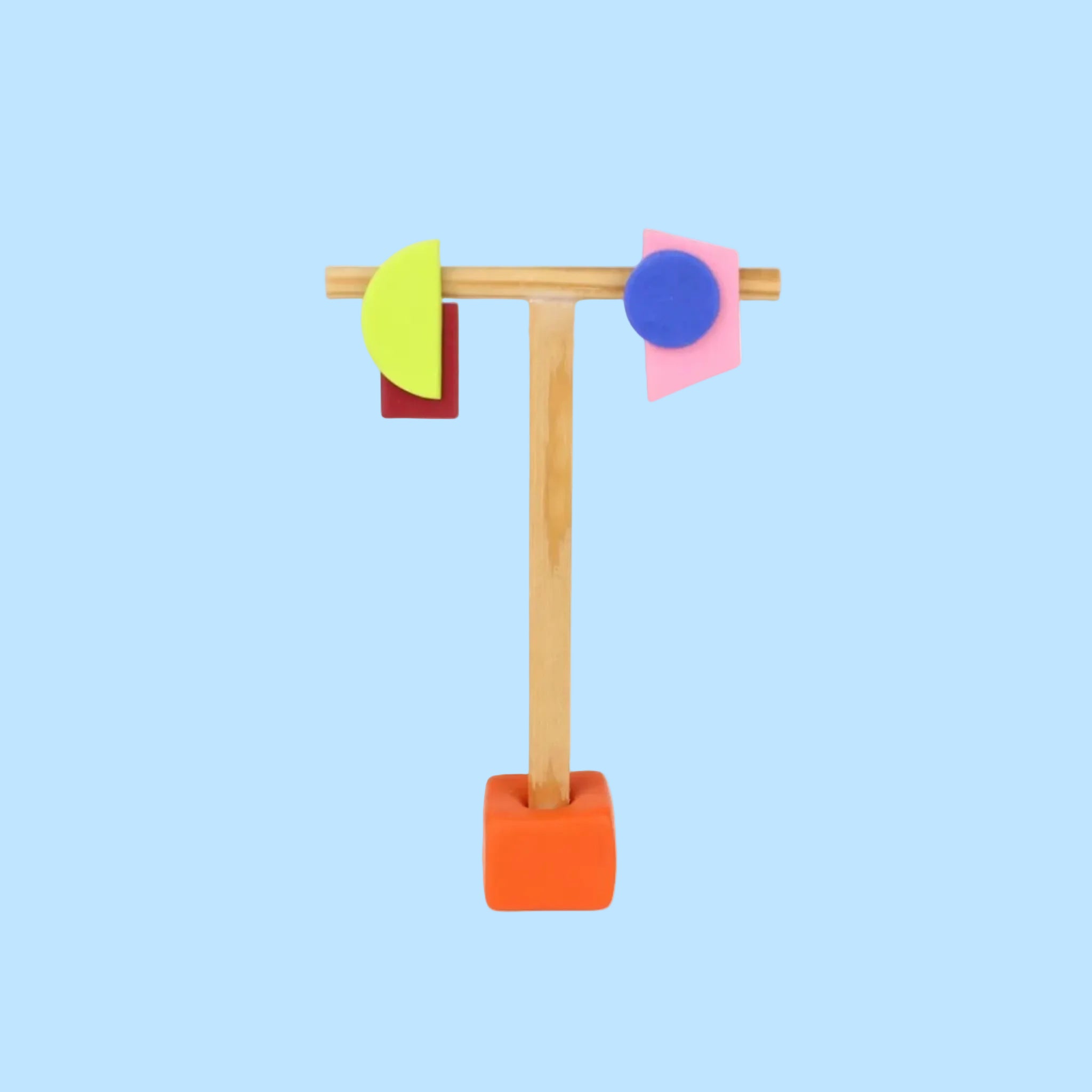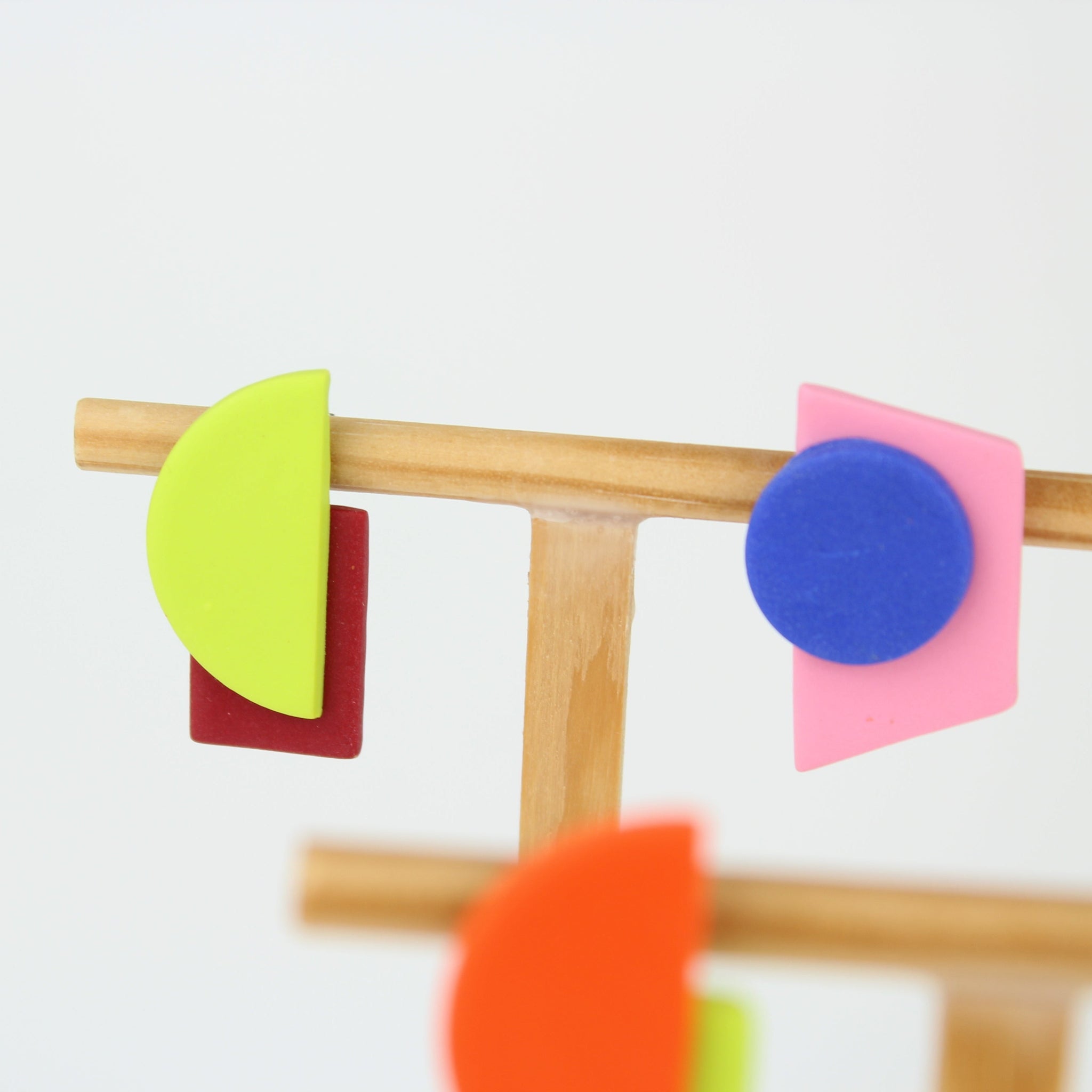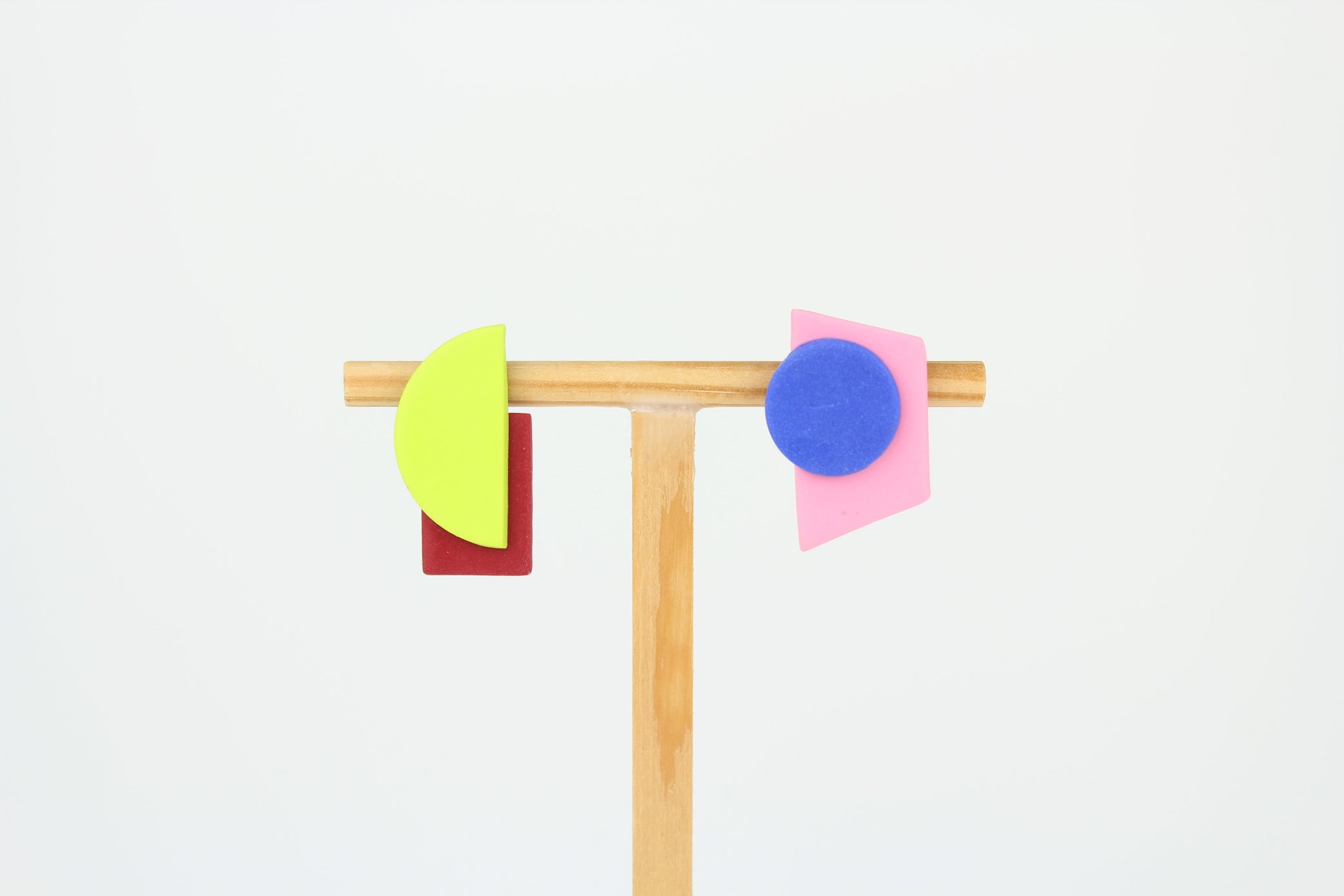 Schmuck gegen langweilig. Geometrische Ohrhänger, die mit klaren Formen spielen: Halbkreis, Rechteck, Kreis und Trapez fügen sich zu einem asymmetrischen Ganzen. Neongrün, Dunkelrot, Blau und Rosa setzen selbstbewusste Farbakzente und bringen Balance zwischen Fläche und Volumen – reduziert, grafisch, präzise.