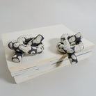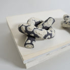 Die weißen Flecken sind mit einem Pinsel wild auf den schwarzen, unlasierten und rauen Ton aufgetupft. Der Knoten wirkt dadurch weniger wie ein festes Band als wie ein lebendiges Element – ruhig, geerdet und doch irgendwie aufregend.