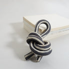 Die Linien ziehen sich in unregelmäßigem Rhythmus über die raue Oberfläche – mal schmal, mal breit,mal gerade, mal nicht. Sie verleihen dem Objekt eine fast pflanzliche Textur, als wäre es über Jahre hinweg gewachsen statt geformt. Der Knoten wirkt dadurch weniger wie ein festes Band als wie ein lebendiges Element – ruhig, geerdet und voller innerer Bewegung.