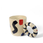Der Henkel setzt einen starken Kontrast: ein klarer Kreis, grafisch gestreift – und dann die kleinen Punkte. Als hätte die Keramikkünstlerin Alice beim Dekorieren kurz gezögert und dann doch noch etwas Persönliches hinterlassen.